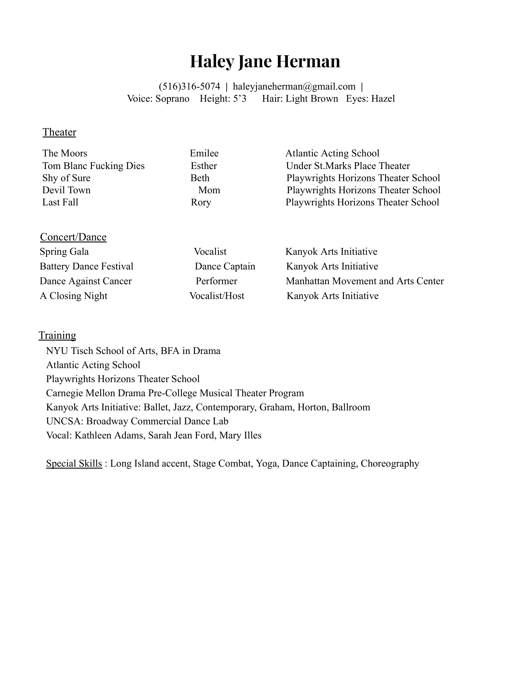 Haley Jane Herman is a New York based actor, singer, and dancer with a passion for directing and playwriting. With an open heart and poised intellect, Haley brings an abundance of warmth and visceral depth to stories across theater, film, and dance. She is pursuing a BFA in Drama at NYU Tisch School of the Arts with a minor in producing.